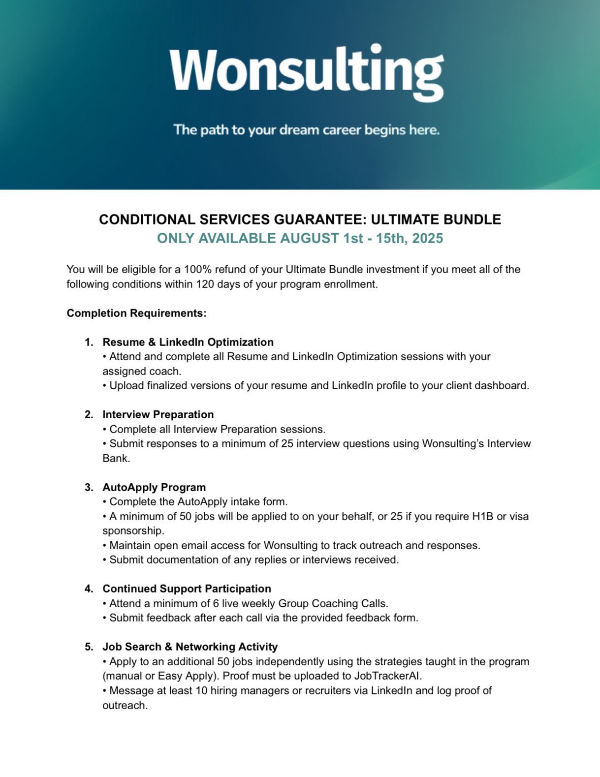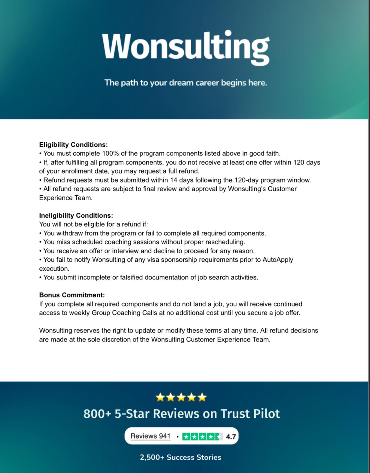 • You fail to notify Wonsulting of any visa sponsorship requirements prior to Full-Service Apply To Jobs execution.
