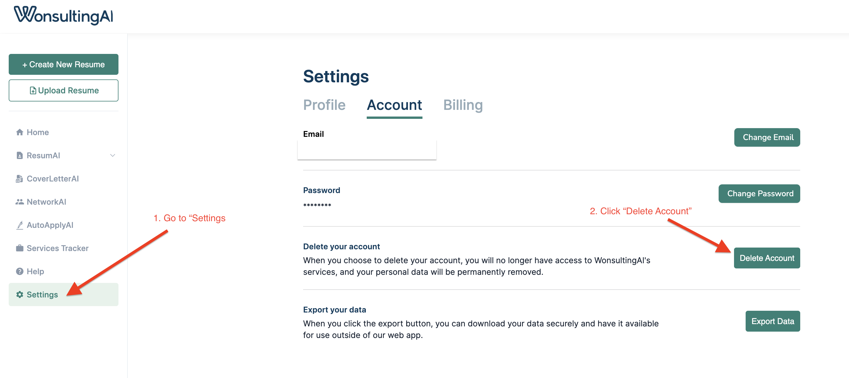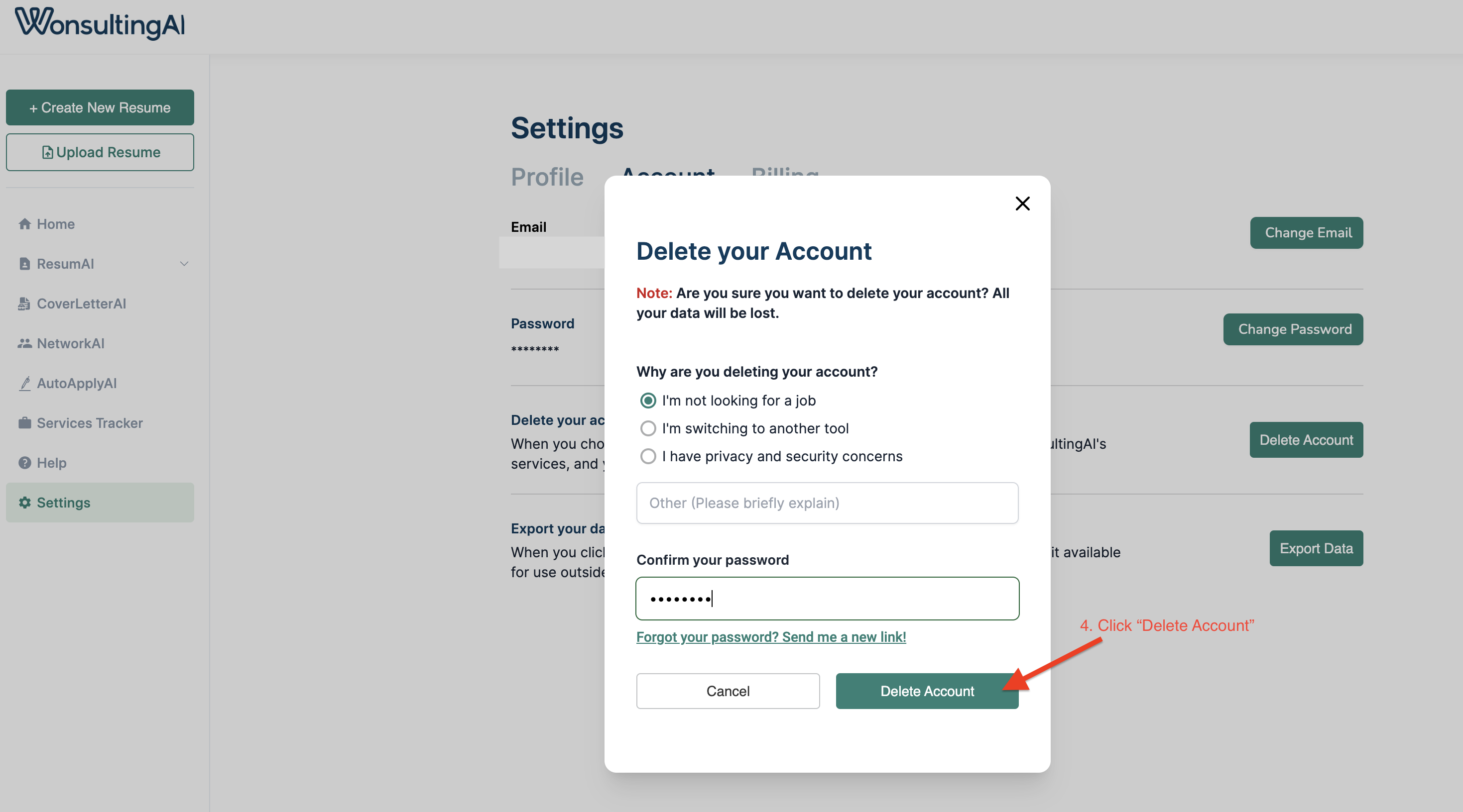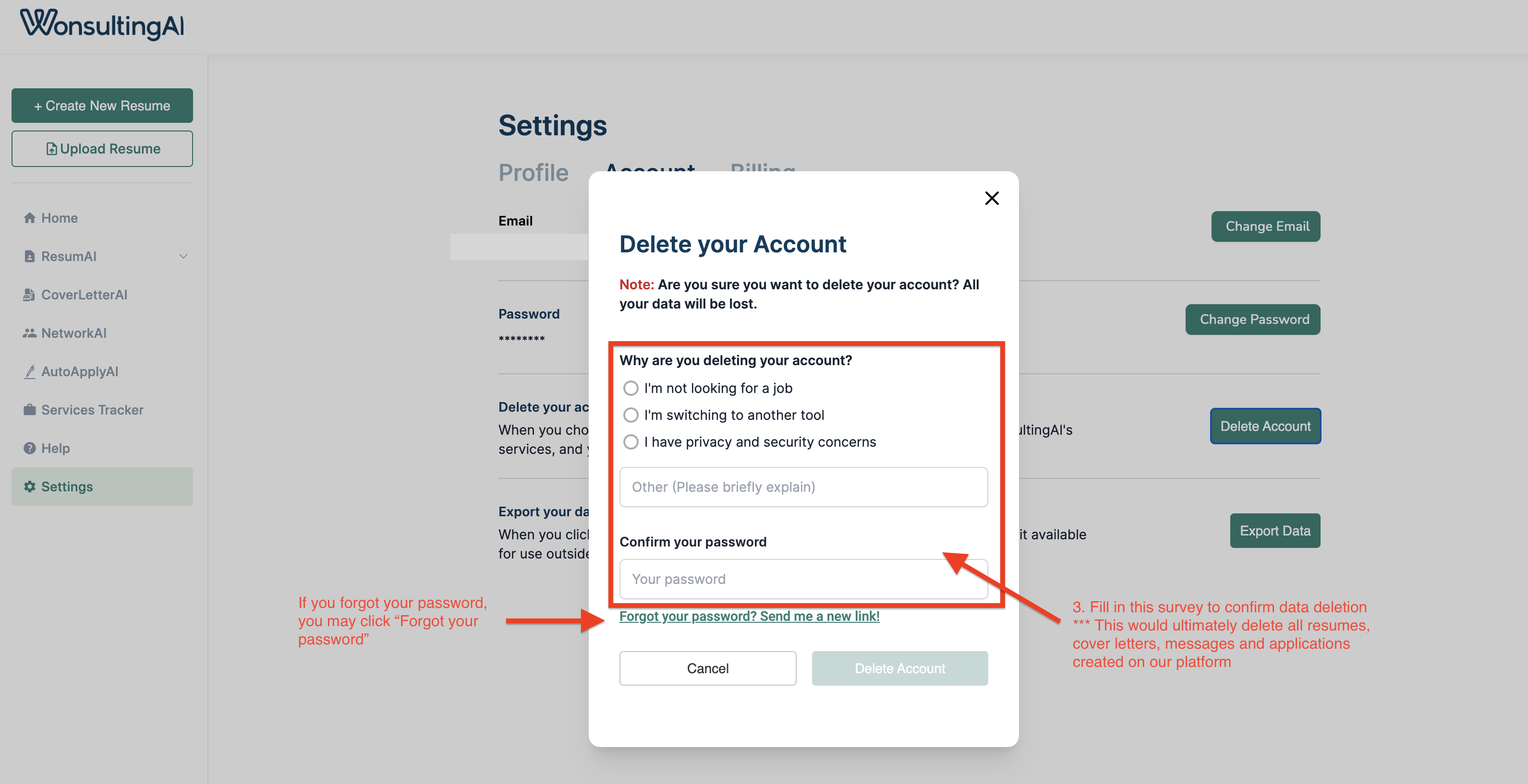 You will be asked to specify why you would like to delete your account and will be prompted to confirm your password in order to ensure that you are the one deleting the account. Please note that all your data including saved resumes, cover letters, networking messages and job applications will be lost and you will not be able to recover them once deleted. You may download all of the files you need before you delete your account.